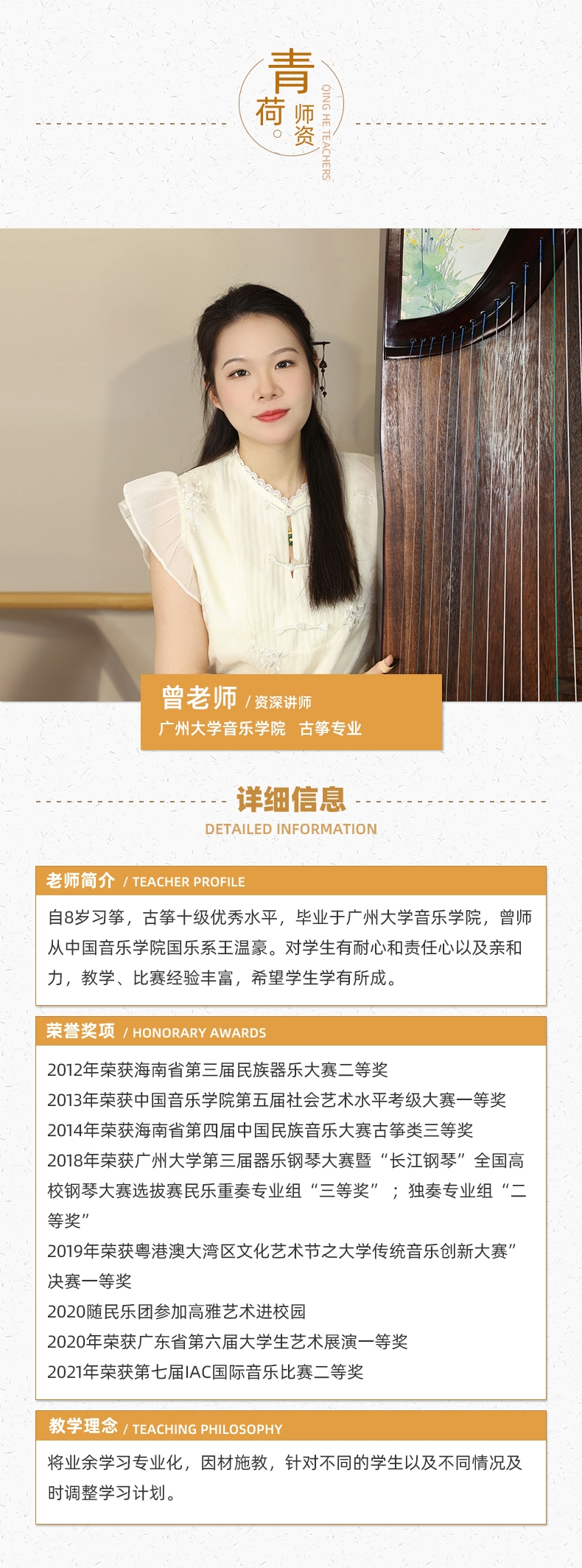 教师简介:自8岁习筝,古筝十级优秀水平,毕业于广州大学音乐学院,曾师从中国音乐学院国乐系王温豪。对学生有耐心和责任心以及亲和力,教学、比赛经验丰富,希望学生学有所成。