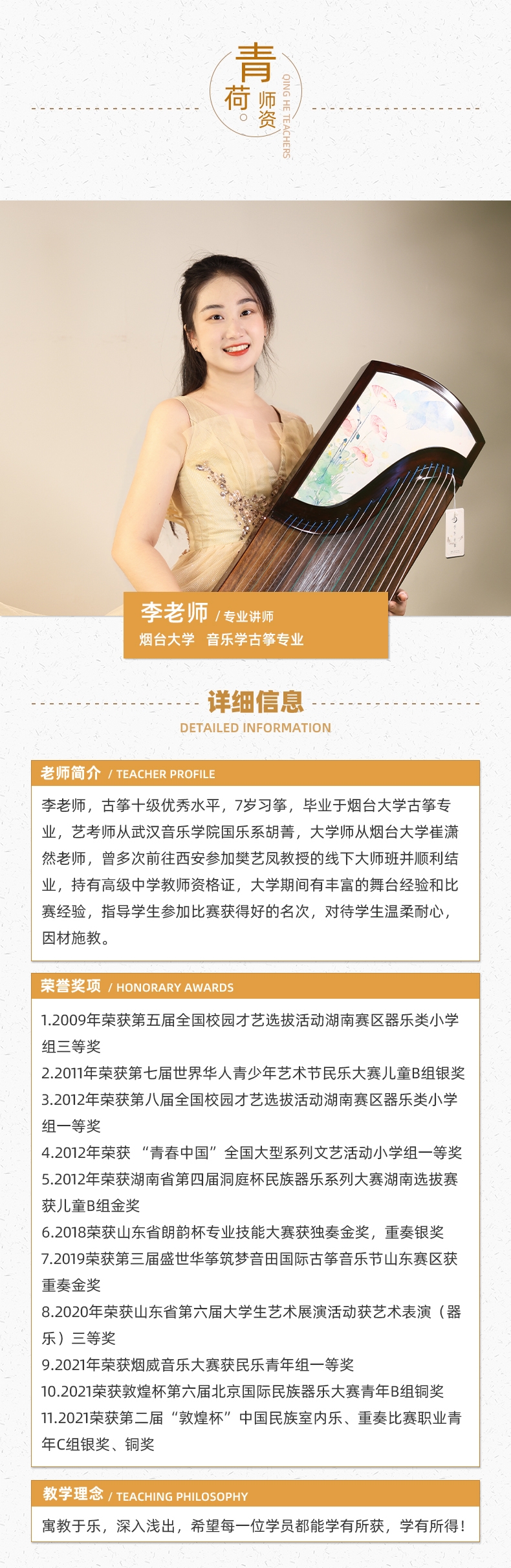 教师简介:李老师,古筝十级优秀水平,7岁习筝,毕业于烟台大学古筝专业,艺考师从武汉音乐学院国乐系胡菁,大学师从烟台大学崔潇然老师,曾多次前往西安参加樊艺凤教授的线下大师班并顺利结业,持有高级中学教师资格证,大学期间有丰富的舞台经验和比赛经验,指导学生参加比赛获得好的名次,对待学生温柔耐心,因材施教。