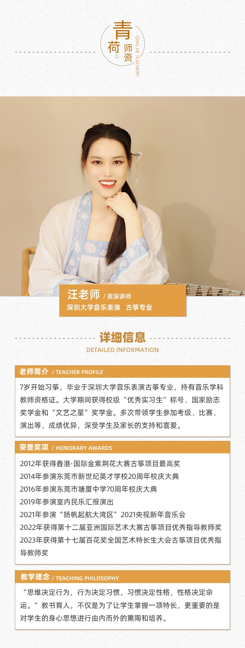 教师简介:7岁开始习筝,毕业于深圳大学音乐表演古筝专业,持有音乐学科教师资格证。大学期间获得校级“优秀实习生”称号、国家励志奖学金和“文艺之星”奖学金。多次带领学生参加考级、比赛、演出等,成绩优异,深受学生及家长的支持和喜爱。