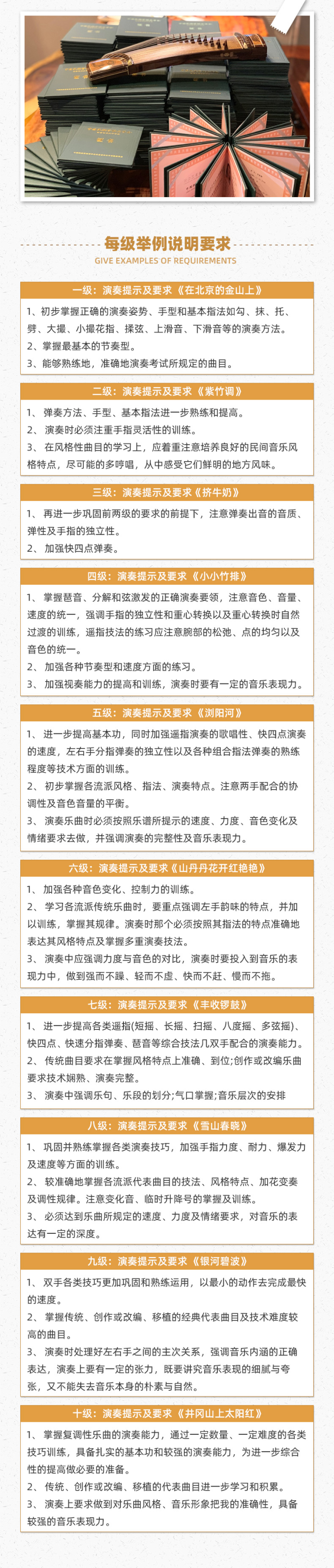 课程特色:系统的掌握所考级别的基本技法,注重台风、技巧的训练,理解所考曲目的内涵及演奏要点,从而在考试中加分,在考级中能取得优异成绩。