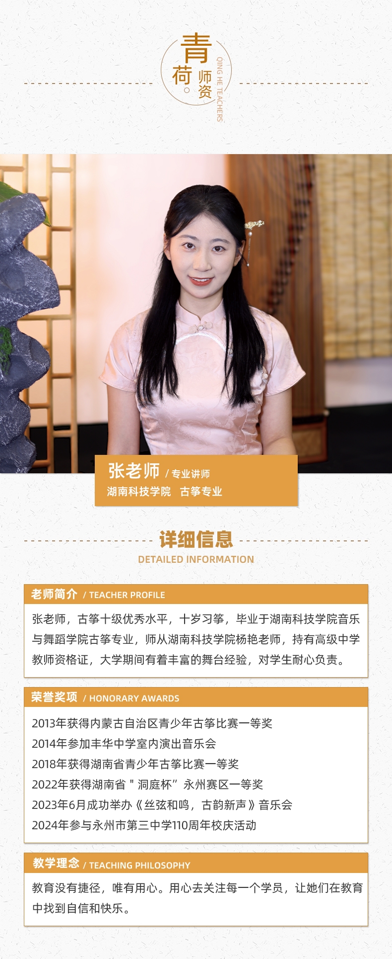 教师简介:张老师,古筝十级优秀水平,十岁习筝,毕业于湖南科技学院音乐与舞蹈学院古筝专业,师从湖南科技学院杨艳老师,持有高级中学教师资格证,大学期间有着丰富的舞台经验,对学生耐心负责。