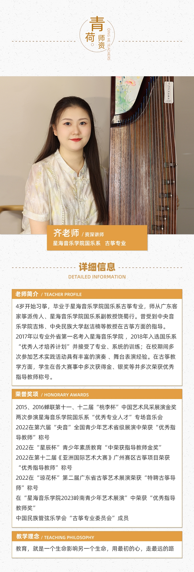 教师简介:4岁开始习筝,毕业于星海音乐学院国乐系古筝专业,师从广东客家筝派传人、星海音乐学院国乐系副教授饶蜀行。曾受到中央音乐学院吉炜、中央民族大学赵洁楠等教授在古筝方面的指导。 2017年以专业外省第一名考入星海音乐学院,2018年入选国乐系“优秀人才培养计划”并接受了专业、系统的训练;在校期间多次参加艺术实践活动具有丰富的演奏、舞台表演经验。在古筝教学方面,学生在各大赛事中多次获得金、银奖等并多次荣获优秀指导教师称号。